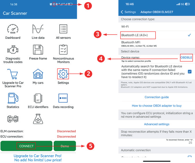 (2). Ťuknite na [Adapter OBDII ELM327]. Vyberte [Typ pripojenia:]