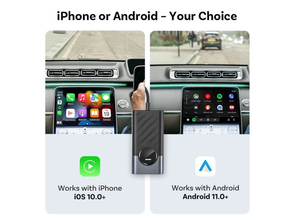 - prevádza CarPlay / Android auto po kábli na bezdrôtové